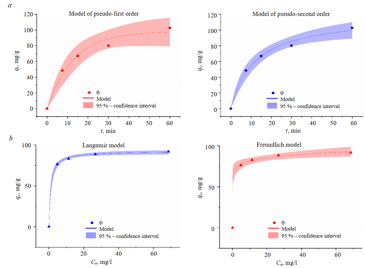 Analysis of sorption isotherms revealed that the experimental data correspond to the Langmuir model with the maximum adsorption capacity of 92.3±0.9 mg/g (Fig.6, b, Table 3) based on the fact that a monomolecular sorption layer forms on the surface of saponite, and all active sites have equal energy and enthalpy of sorption [41-43].
