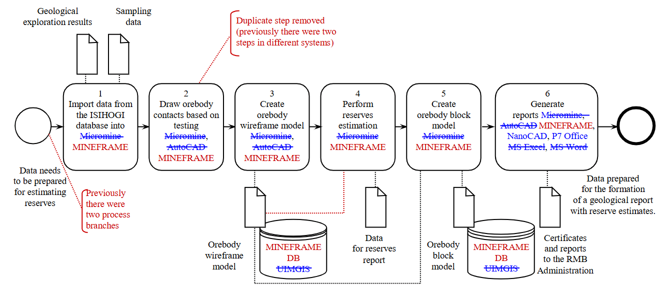 Following the provisions of this methodological approach, prior to initiating the integration of the national mining and geological information system (MGIS) into the engineering support for mining operations, experts from MINEFRAME Lab LLC assessed the level of digital enablement across various divisions of PJSC ALROSA. This assessment formed the basis for developing an adaptation and software modification plan. Transition and target diagrams (to be) were developed for the most critical business processes (Fig.1).