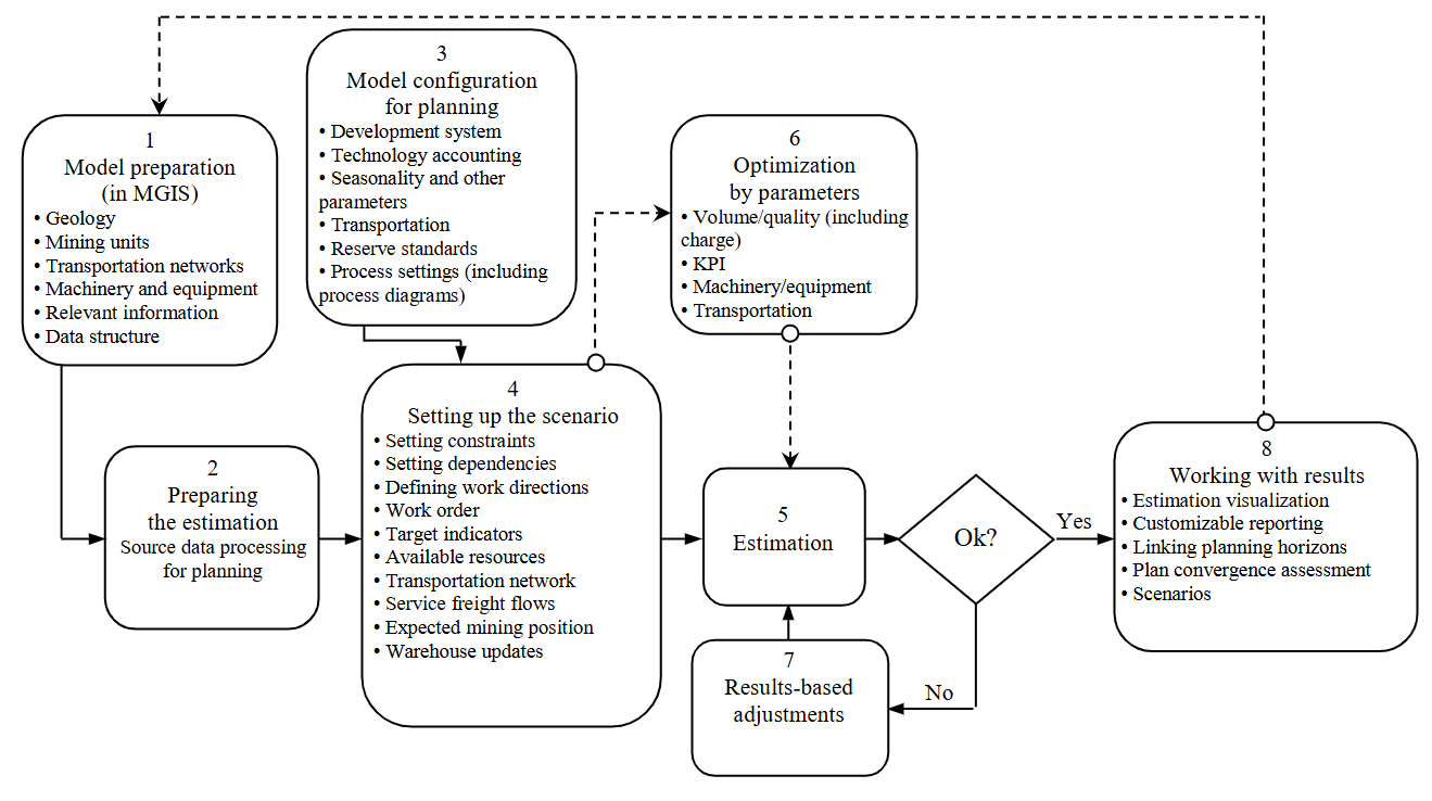 The planning unit for open-pit and underground mining operations is based on a unified optimization algorithm within the framework of constraint programming [28-32] and simulation modelling methods (Fig.3). The main principles of its operation are as follows: