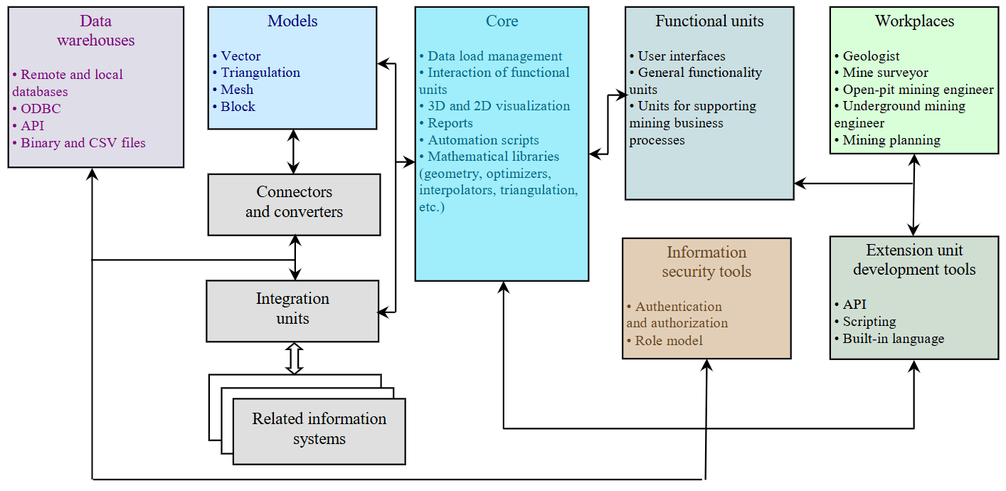 - separation of system tools (development, visualization, editing, saving, and loading of models) and working tools (solving specific mining and geological tasks), achieved through the development of a cross-platform core and dynamically connected units;