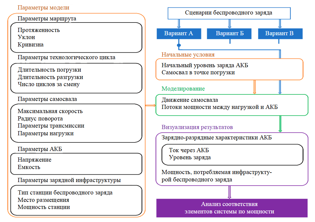 В работе предложена математическая модель, описывающая взаимодействие аккумуляторного карьерного самосвала с инфраструктурой беспроводного заряда при разных сценариях заряда. Модель является инструментом для сравнения вариантов реализации инфраструктуры беспроводного заряда и принятия проектных решений. Она описывает потоки мощности между зарядной инфраструктурой и АКБ самосвала при реализации технологического процесса. При допущениях постоянства длительности технологических операций погрузки и разгрузки, скорости движения самосвала по прямолинейным участкам трассы, постоянства коэффициента трения качения, емкости АКБ и параметров его разрядной кривой модель позволяет оценить параметры АКБ и станций беспроводного заряда и определить различные эксплуатационные характеристики системы, в частности электропотребление зарядных станций.