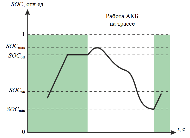 Величины SOCon и SOCoff представляют собой пороговые значения для включения и выключения беспроводной передачи энергии при нахождении самосвала в месте расположения инфраструктуры беспроводного заряда. При нахождении самосвала на трассе возможно как повышение SOC выше SOCoff, например в результате рекуперации энергии при движении на спуск, так и снижение SOC ниже SOCon. Снижение как ⟨SOC⟩, так и (SOCmax – SOCmin) будет способствовать замедлению износа АКБ. Конкретные значения SOCon и SOCoff целесообразно корректировать по результатам моделирования. Однако для предотвращения перезаряда АКБ следует выбирать SOCoff меньше единицы, пропорционально увеличивая емкость АКБ.
