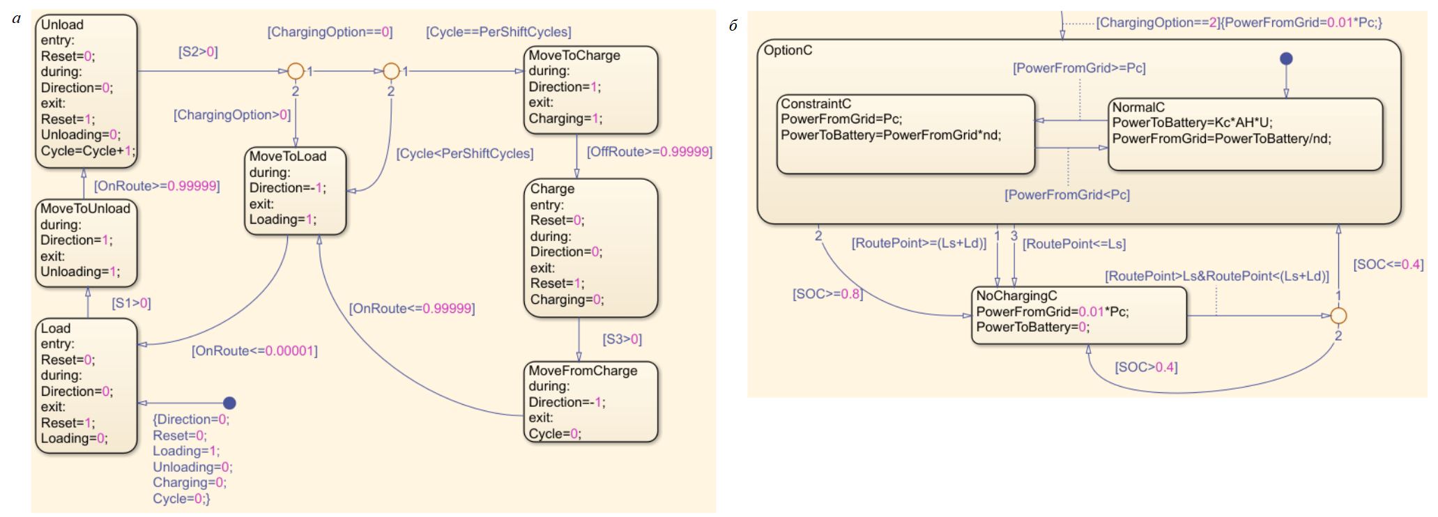 Сценарии выбора направления движения самосвала по трассе и включения-отключения беспроводной передачи энергии реализованы на базе Stateflow.Chart (рис.3). В качестве начального состояния принято, что самосвал прибыл в точку погрузки, т.е. при t = 0 значение l = 0, а его АКБ заряжен до уровня SOC0.