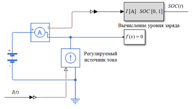 Модель заряда-разряда АКБ может быть принята с разным уровнем детализации [37-39]. В данной работе текущий уровень заряда АКБ в зависимости от I определяется кулонометрическим методом: