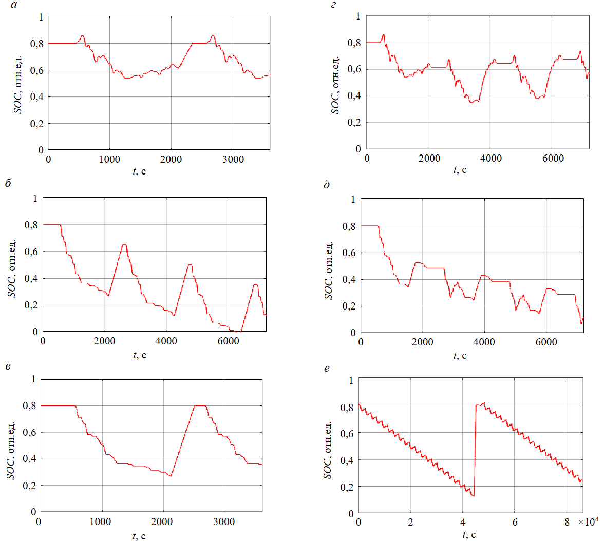 Рис.7. ГрафикиSOC(t): а – вариант Б, рекуперация есть, Kc = 3; б – вариант Б, рекуперации нет, Kc = 3; в – вариант Б, рекуперации нет, Kc = 5; г – вариант В, рекуперация есть, Kc = 3; д – вариант В, рекуперации нет, Kc = 3; е – вариант А, рекуперация есть, Kc = 3