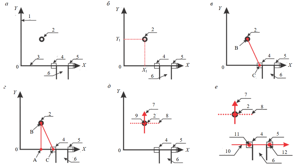 Рис.1. Последовательность определения координат подвижного объекта в декартовой системе координат на выделенной локальной площадке: а – расположение виртуальных координатных осей и мачт въездных ворот относительно технологической дороги; б – пример определения координат подвижного объекта (координаты Х1, Y1); в – расположение гипотенузы СВ виртуального треугольника между устройствами определения координат; г – расположение виртуальных линий АВ и AC (координаты подвижного объекта); д – пример расположения на подвижном объекте нулевой точки энкодера в устройстве определения координат; е – пример нулевого положения энкодера устройства определения координат в мачте въездных ворот
