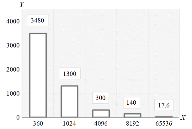 Рис.2. Диаграмма зависимости отклонений значений проекций точки А при измерении угла АСВ в расчетном размере отрезка АВ (координат оси 0Y) от разрешающей способности энкодера на расстоянии 200 м до подвижного объекта; Х – типовые значения разрешающей способности выпускаемых абсолютных энкодеров, шагов на оборот; Y – предельное отклонение от расчетного расстояния до подвижного объекта между шагами энкодера при удалении на 200 м, мм