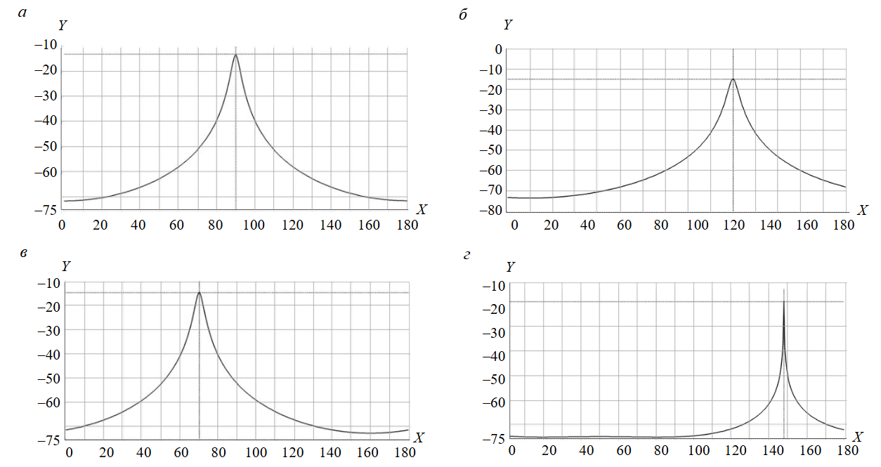 Рис.3. Фрагменты лицевых панелей во время полевых исследований: а – прямая видимость объекта, азимут 90°; б – объект расположен справа под углом 120°; в – объект расположен слева под углом 70°; г – объект расположен под углом 148°; Х – мощность сигнала, дБм; Y – пеленгационный спектр угла направления сигнала, град