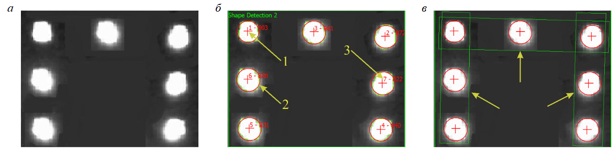 Установка центральной координатной точки в выделенном регионе опорных световых маркеров светового табло на видеоизображении определяется как центральная координата, относительно которой осуществляется распознавание контуров окружностей горизонтальных и вертикальных КМП (три слева или справа). На рис.4 приведен пример последовательности обработки изображения при определении контуров окружностей координатных маркеров и их количества в условиях освещенности 300 лм с расстояния 8 м камерой NI 1742 Smart Camera с характеристиками: тип матрицы – CCD монохромная, разрешение – 640×480 пикселей, размер пикселя – 7,4·10–6 м на 7,4·10–6 м, светосила объектива – F/1,4.