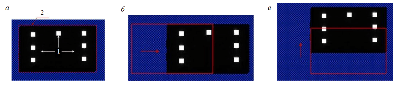 Процесс проверки положения контрольных точек КМП по горизонтали и вертикали системой машинного зрения определяет их так, чтобы количественный состав всех маркеров находился в прямоугольной области региона интереса как по горизонтали, так и по вертикали.