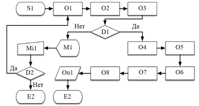Описанный метод определения координат показан на рис.6 в виде алгоритма, где S1 – начало; О1 – построение виртуальных осей координат; О2 – подготовка и запуск устройств определения координат; О3 – определение пеленга на подвижный объект; D1 – решение «Пеленг на подвижный объект найден?»; М1 – сообщение «Ошибка в обнаружении пеленга. Повторить поиск?»; Mi1 – ручной ввод «Да/Нет»; Е2 – конец/стоп; О4 – установка моторизованными приводами устройства определения координат на подвижном объекте и мачте въездных ворот вдоль одной оси по данным пеленга; О5 – подстройка моторизованными приводами направления по данным системы машинного зрения; О6 – настройка моторизованными приводами точного направления с помощью массива чувствительных фотодиодов и лазерного излучателя; О7 – измерение лазерным дальномером отрезка СВ (см. рис.1, в) и угла поворота лазерного дальномера АСВ (см. рис.1, г) энкодером устройства определения координат в левой мачте въездных ворот; О8 – расчет координат подвижного объекта; Ou1 – ввод координат подвижного объекта в систему управления.