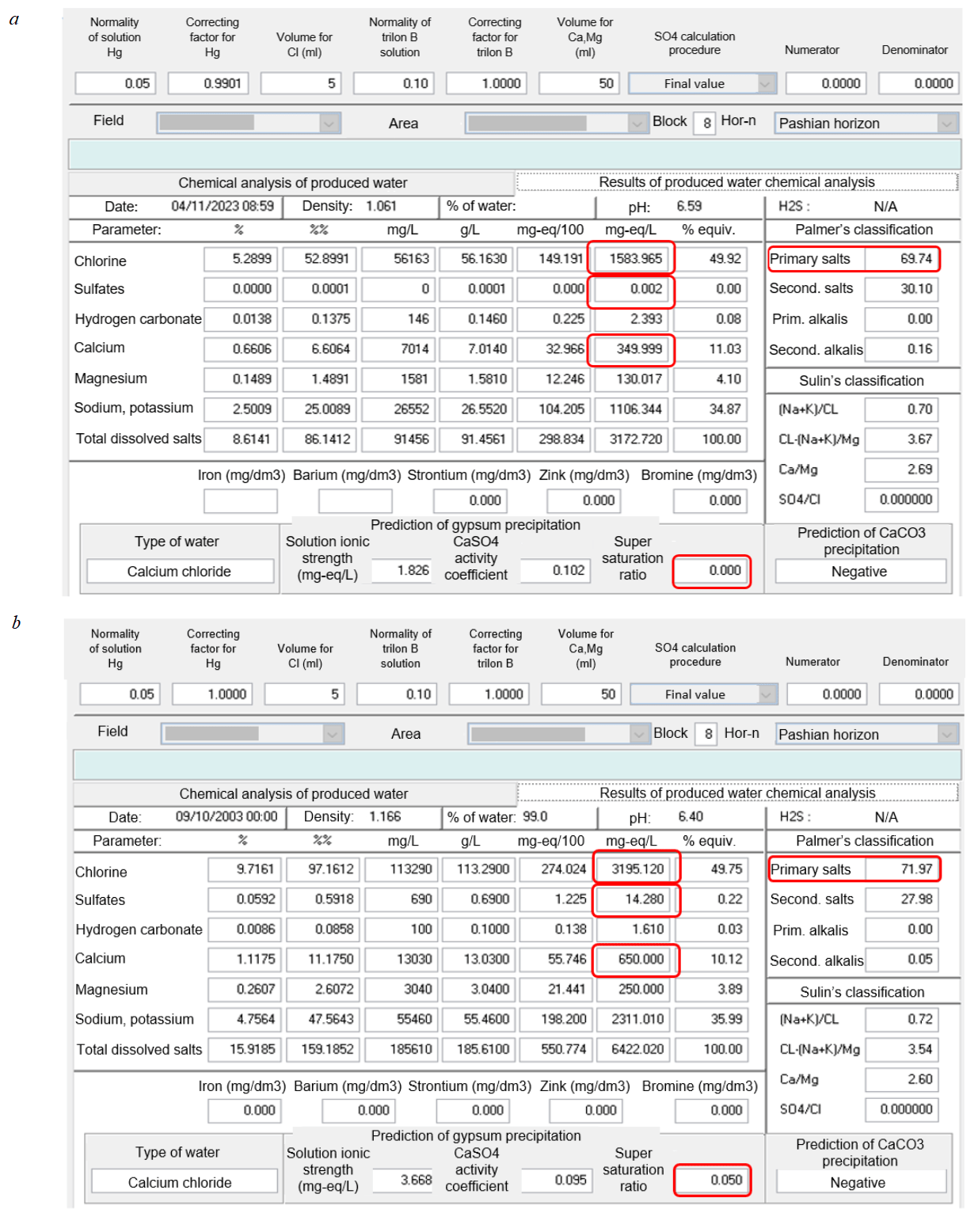 Fig.1. Results of water chemical analysis: for wells with leak-tight (a) and leaking (b) production casing