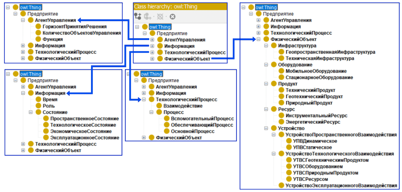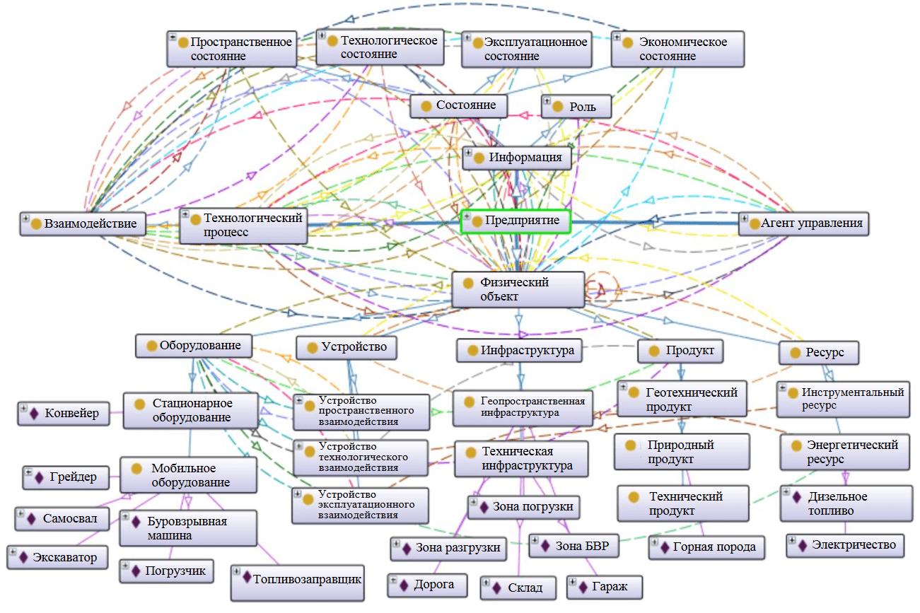 - под физическими объектами понимаются элементы производственной среды, не обладающие самостоятельностью принятия решений, включая: оборудование (конечные экземпляры – самосвал, конвейер, экскаватор и т.д.), инфраструктуру (геопространственная – дорога, борт, отвал; техническая – зона погрузки, склад, гараж ТОиР), устройства (составные элементы оборудования – ковш, шасси и т.д.), продукт (природный – блок горной породы; геотехнический – дорожное полотно; и т.д.), ресурс (энергетический – топливо, электричество; инструментальный: вода, взрывчатое вещество);