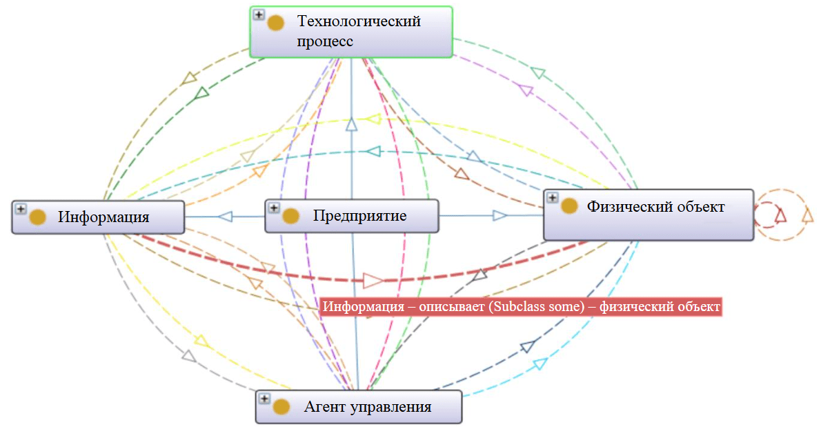 Таким образом, рассмотренные стандарты во многом не релевантны целям, задачам и условиям цифровой трансформации горно-добывающих предприятий. Однако следует отметить их главную особенность – попытку формализовать связь между принципиально разными компонентами предприятий, такими как абстрактные концепты организации бизнес-процессов (регламенты, условия, требования, роли персонала и т.д.), реально существующими объектами физического мира (датчики, оборудование, продукция, ресурсы, инфраструктурные элементы), информацией (формальные и неформальные экспертные знания; цифровые, аналоговые и нейрофизиологические сигналы, измеряемые параметрами; и др.) и программными сущностями, реализующими набор функциональных задач управления. Иными словами, в контексте построения модели архитектуры предприятия речь идет о формировании знаний о системе с целью построения механизмов управления, то есть фактически – об онтологическом моделировании. Так, модель архитектуры можно неформально определить некоторой онтологией, которая может быть трансформирована в базу знаний с механизмами доказательства непротиворечивости и истинности заложенных в нее высказываний, а также механизмами логического вывода для принятия решений управления предприятием.
