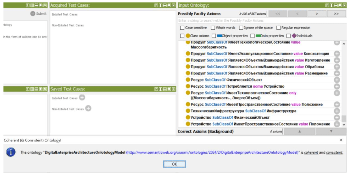 Для определения достижения ключевой цели настоящего исследования – подтверждения консистентности полученной онтологии, использован один из наиболее традиционных и развитых ризонеров дескрипционный логики – HermiT ver. 1.4.3.456 [36]. Ризонер представляет механизм логического вывода для доказательства полноты и непротиворечивости заложенных аксиом и выведения скрытых апостериорных связей в семантическом графе.