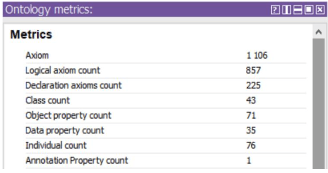 Рис.7. Метрики онтологии в части числа аксиом, классов, отношений и экземпляров