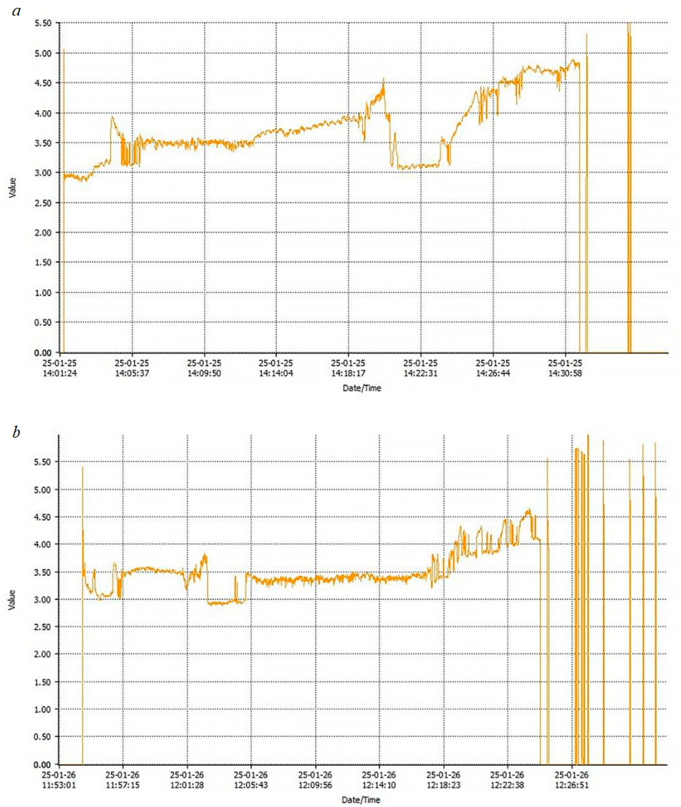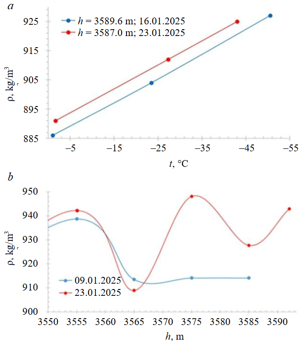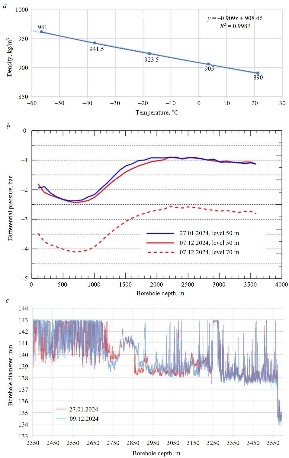Figure 4, a shows the results of measuring the temperature-dependant density of fluids sampled by MS on 16.01.2025 from a depth of 3589.6 m (before the PMS-3 delivery) and on 23.01.2025 from a depth of 3587.0 m (after the PMS-3 deli-very). Each curve is constructed using three mea-surement points and has a linear dependence. The graph shows an increase in the DF density after delivery of PMS-3 to the bottomhole zone of the wellbore, measured at atmospheric pressure (the average annual pressure at the Vostok Station is 460 mm Hg), which indicates the presence of PMS-3 in the bottomhole zone. The obtained samples were sent to the Saint Petersburg Mining University for chemical analysis – determination of the PMS-3, Jet A-1 kerosene, and dichlorofluoroethane HCFC-141b concentrations, which will allow a final interpretation of the sampling data.
