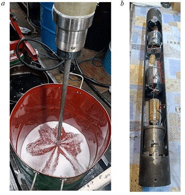 At the first stage, the device was tested on the surface, and then in the borehole at depths of 1250 and 3595 m. The tests (Fig.3, a) enabled to choose the optimal operating modes of the device. In particular, the performance of the ECN-91 electric centrifugal pump, the method for delivering the drilling fluid to the bottomhole was adjusted, and instructions for working with the device were written.