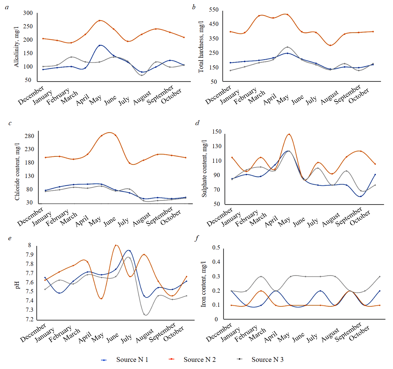 The research shows that the environment at all water sources remains slightly alkaline throughout the year; however, pH values slightly decreased in summer (Fig.1, e). This may be associated with increased biological activity [30]. The dynamics of pH changes generally correlate with alkalinity (Fig.1, a), particularly noticeable in source N 3. When alkalinity decreases, the buffering capacity of the water drops, which may lead to a slight decrease in pH.