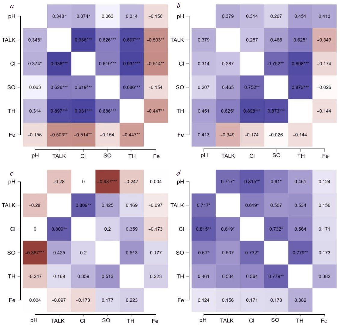 Fig.2. Pearson correlation for water parameters: a – for the entire sample; b – water source N 1; c – water source N 2; d – water source N 3