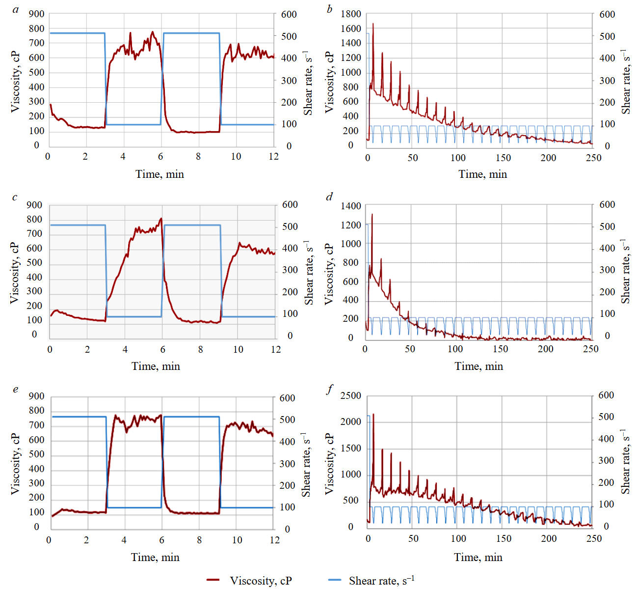 Rheological studies were conducted in accordance with the ISO 3219:1993 standard. Key rheological properties were determined via shear sensitivity tests (simulating fluid movement through production tubing followed by movement through the reservoir bed) and tests of the breakdown rate of the crosslinked system. The studies were carried out using Brookfield PVS high‑pressure rheometers at a temperature of 32 °C. To improve the research accuracy, shear sensitivity tests were performed twice for each sample. The main parameters determined in the rheological tests were the time required to restore dynamic viscosity after removing the shear load and the system breakdown rate.