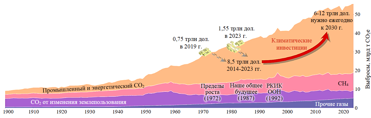 Рис.1. Динамика выбросов парниковых газов и данные о климатических инвестициях