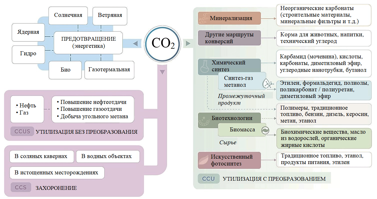 CCU|S представляет собой группу технологий, позволяющих взамен предотвращения выбросов CO2 вовлечь его в различного рода технологические цепочки (рис.2), которые можно разделить на три группы:
