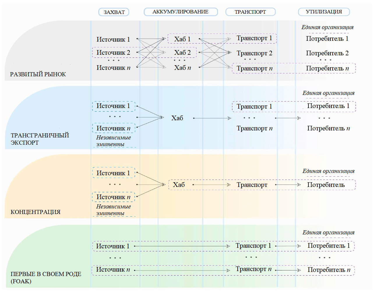 Возможным решением этой проблемы является использование организационных схем, связанных с образованием кластеров улавливания СО2 с совместной инфраструктурой, которым практически не уделяется внимание в международной литературе, в отличие от кластеров транспортировки и захоронения. Важность этого вопроса определяется тем, что именно на этапе улавливания осуществляется 60-80 % совокупных затрат большинства проектов CCU|S.