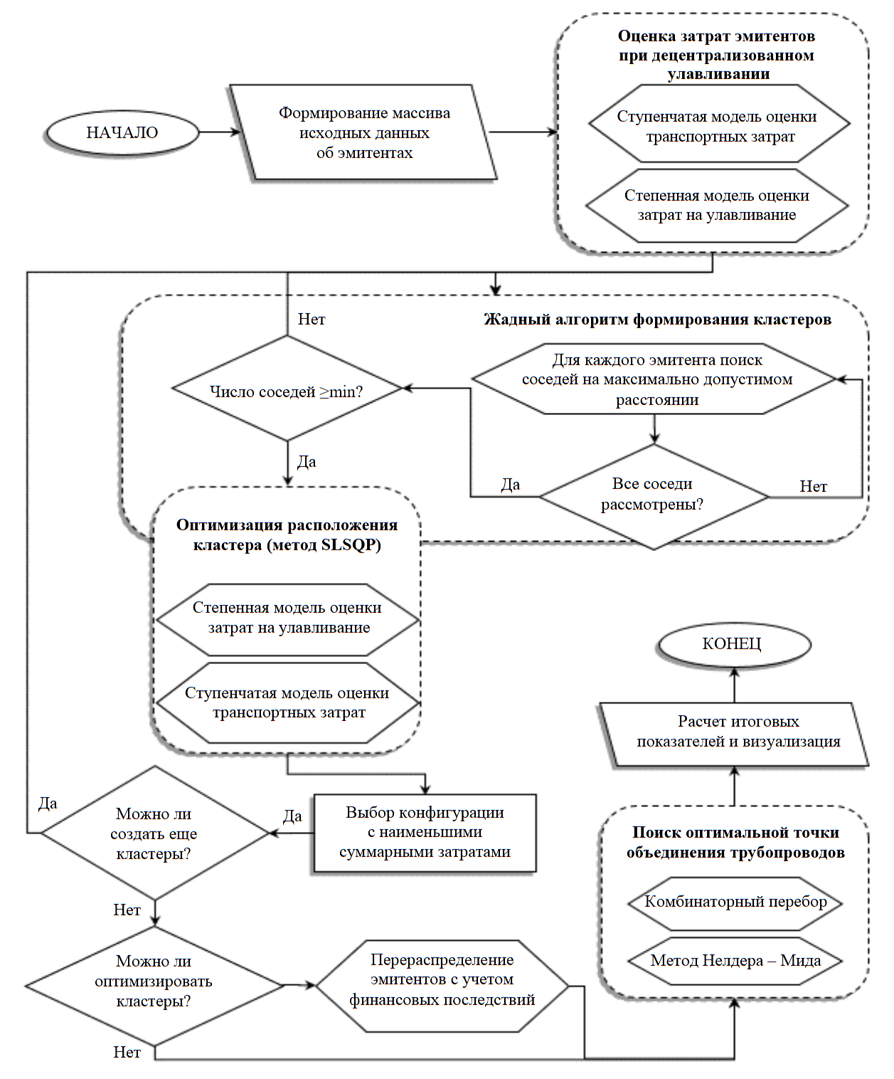 Одним из перспективных вариантов сокращения выбросов CO2 являются технологии секвестрации (CCU|S), требующие реализации капиталоемкого этапа улавливания. В данной работе предлагается использование кластерного подхода к его организации, предполагающего сокращение затрат за счет проявления эффекта масштаба при объединении стационарных источников выбросов в единую сеть с совместной инфраструктурой. Для анализа экономических эффектов такой организационной схемы была разработана модель с применением алгоритмов оптимизации (SLSQP, метод Нелдера – Мида и др.), учитывающая пространственные характеристики источников, объемы выбросов и парциальное давление СО2 в газовых потоках. Апробация модели осуществлялась на основе информации о 533 российских промышленных предприятиях энергетической и цементной отраслей, а также черной металлургии с совокупными годовыми выбросами более 0,5 млрд т СО2. Для предварительного анализа пространственных и технологических данных этих предприятий была разработана методика (на основе алгоритма DBSCAN), позволившая выделить 94 географические области их концентрации. Информация о промышленных предприятиях, формирующих шесть крупнейших областей, была использована для моделирования 90 конфигураций проектов улавливания и транспортировки СО2 с совместной инфраструктурой. Результаты показали, что в рассмотренных примерах кластерный подход позволил сократить затраты на улавливание на 6,44-13,51 % в зависимости от максимального радиуса кластера. Дополнительное сокращение транспортных затрат за счет использования общих газопроводов составило в среднем 37,26 и 57,01 % при дальности доставки 200 и 500 км соответственно. При этой же дальности и максимальном радиусе кластера не менее 20 км среднее сокращение совокупных затрат по рассмотренным конфигурациям составило 17,81 %. Полученные результаты подтверждают значимость организационных решений для масштабирования проектов CCU|S и формирования новых межотраслевых технологических цепочек. Предложенные подходы могут использоваться для выбора перспективных зон реализации пилотных проектов CCU|S и планирования высокоэффективных локальных сетей улавливания и транспортировки СО2 с совместной инфраструктурой.