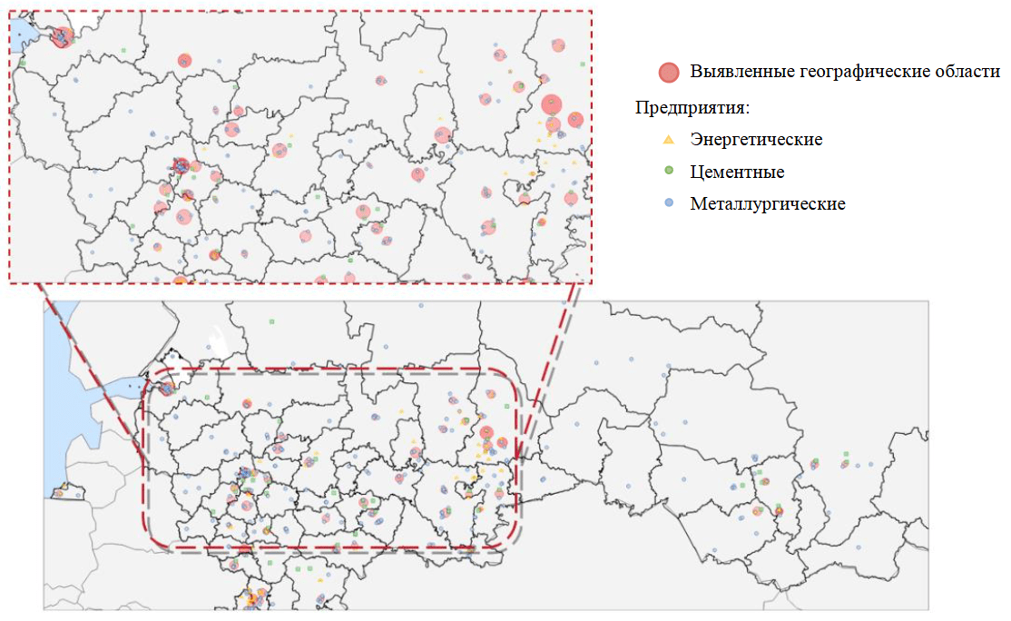 Во-вторых, была разработана модель оценки эффектов от использования кластерного подхода при организации улавливания и транспортировки СО2 с использованием совместной инфраструктуры. Эта модель учитывает пространственные характеристики источников, а также объем выбросов СО2 и его парциальное давление в потоке газа предприятий. Апробация модели осуществлялась на основе информации о промышленных объектах в шести географических областях (из 94 выделенных), отобранных исходя из максимального совокупного объема годовых выбросов СО2.