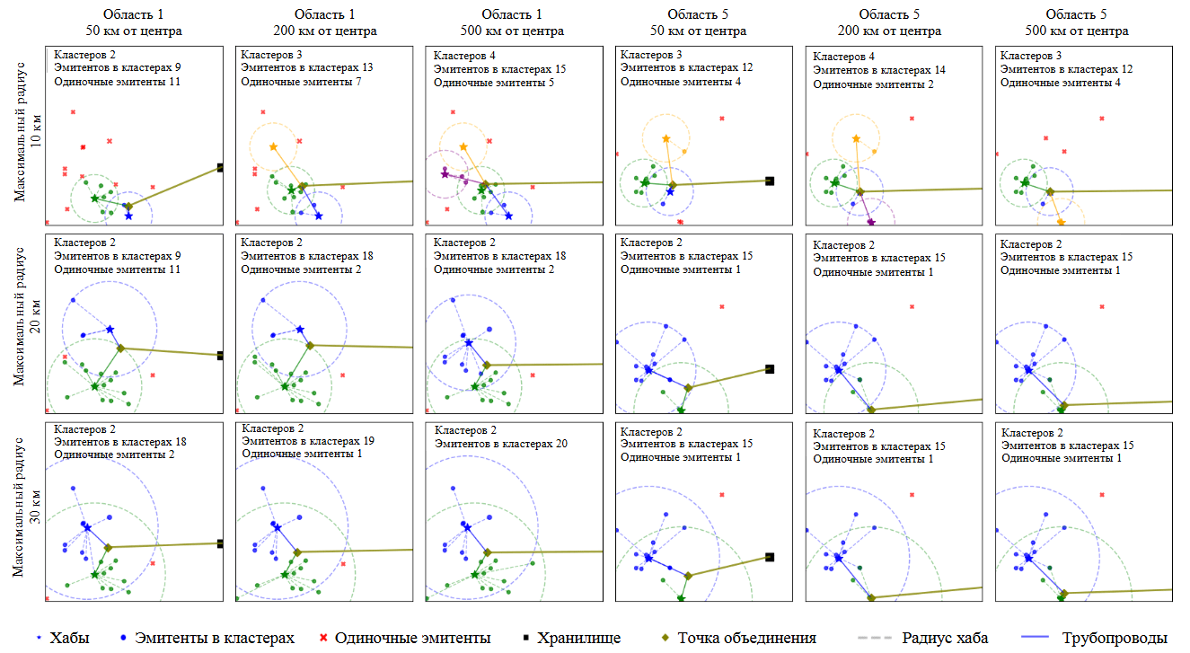 Затраты на транспортировку также связаны с конфигурацией кластеров. С одной стороны, они влияют на оценку целесообразности присоединения отдельных предприятий к кластерам, так как при удалении хранилища CO2 доля транспортных затрат в рассмотренных случаях достигала 17,6 % совокупных затрат. С другой стороны, появление новых/изменение текущих кластеров влияет на процесс поиска точки объединения трубопроводов, что отражается и на затратах. Визуализация пространственной организации различных конфигураций кластеров для областей 1 и 5 (выбраны, исходя из наибольшего числа эмитентов) показана на рис.8.
