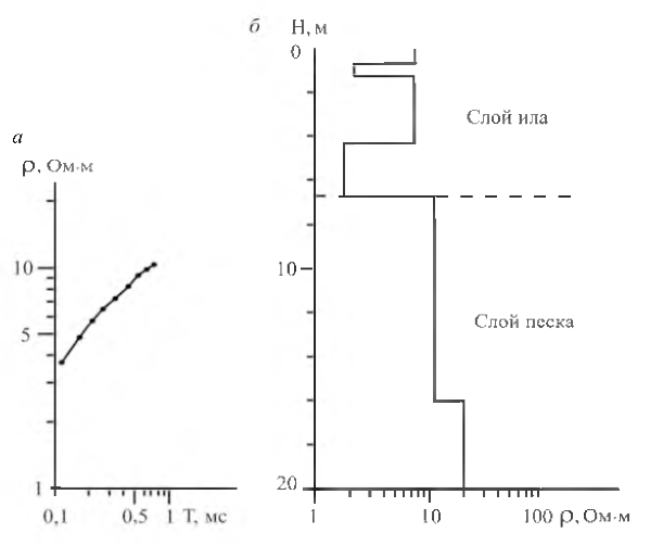 Рис. 2. Типичный пример графика электромагнитного зондирования (а) и интерпретационного геоэлектрического разреза (б).