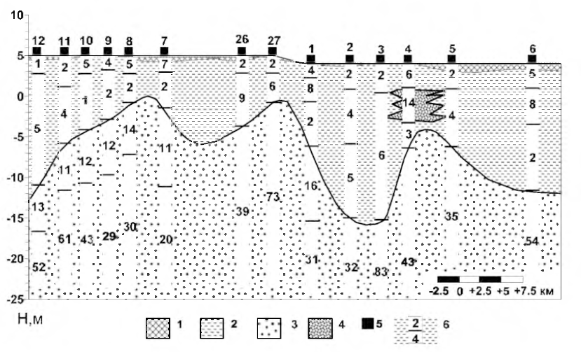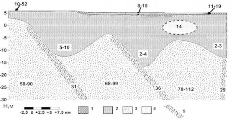 1 – сельскохозяйственный слой; 2 – ил; 3 – крупнозернистый песок; 4 – тонкодисперсный песок;5 – предполагаемое положение зон разрывных нарушений