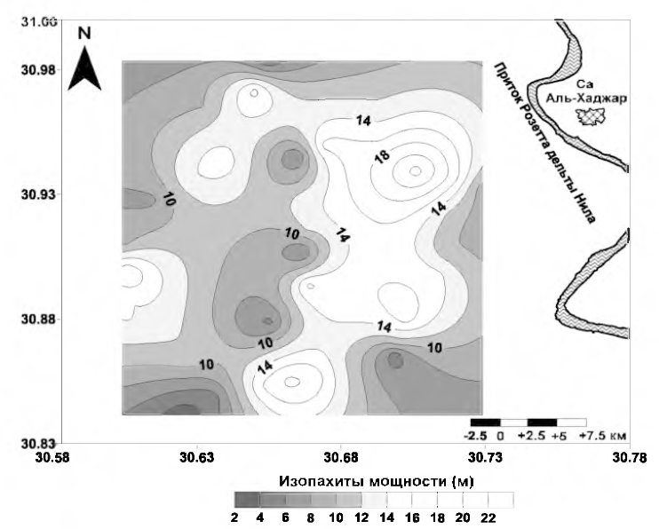 Рис. 4. Изопахиты мощности голоценовых илов дельты Нила (район г. Итай Эль-Баруд)